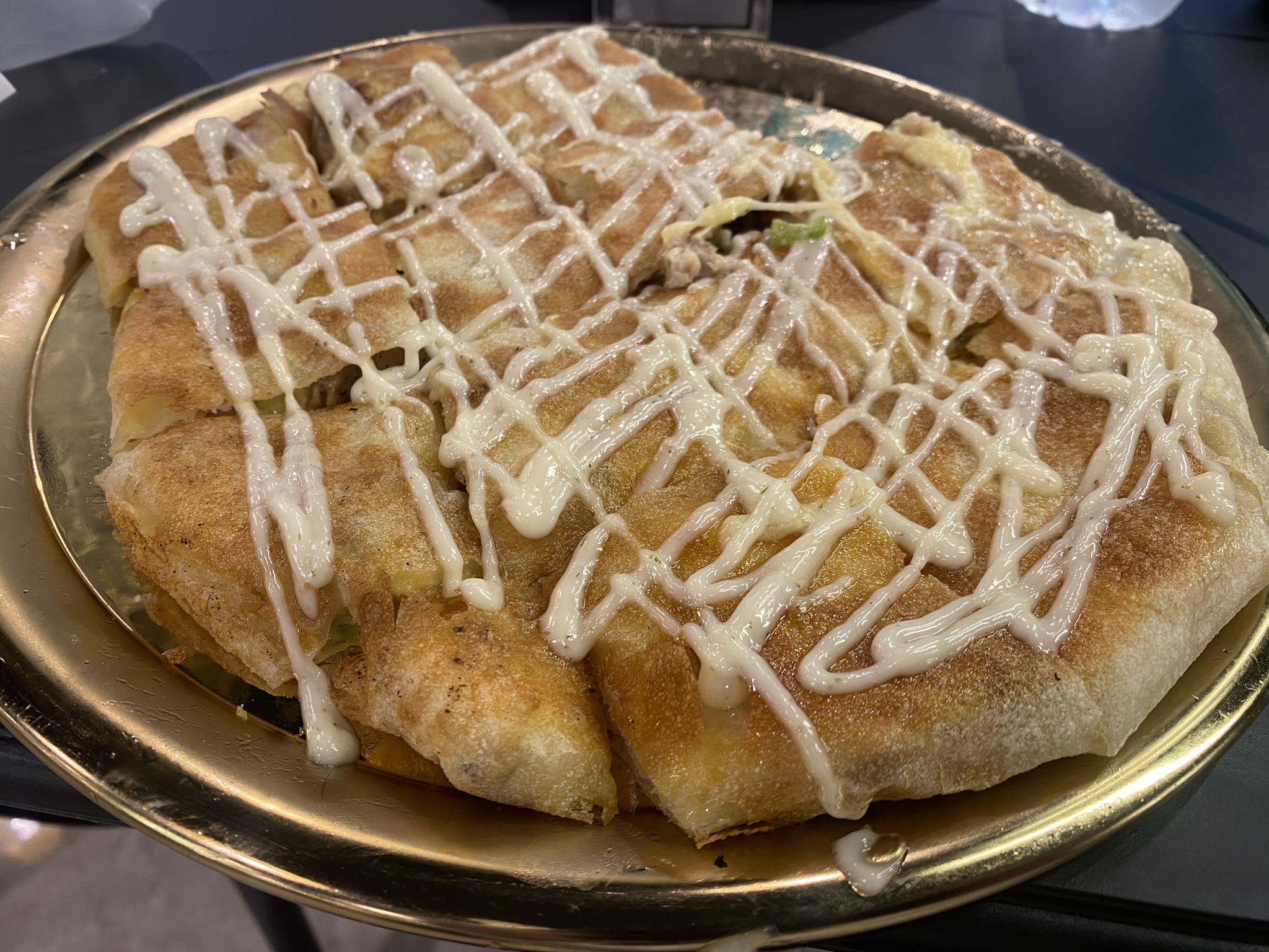 On King Faisal Street, it wasn’t about finding something to eat—I could choose whatever I wanted and ate too much that night. I had a dish I didn’t know the name of, but it was delicious: a kind of Arabic bread stuffed with chicken, baked in a wood-fired oven, with a dressing that made it amazing. I think the restaurant was called “Uncle Sam.”